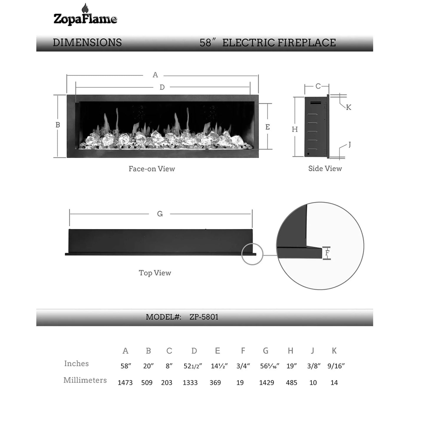 ZopaFlame™ 58" Linear Wall-mount Electric Fireplace - WC19588V