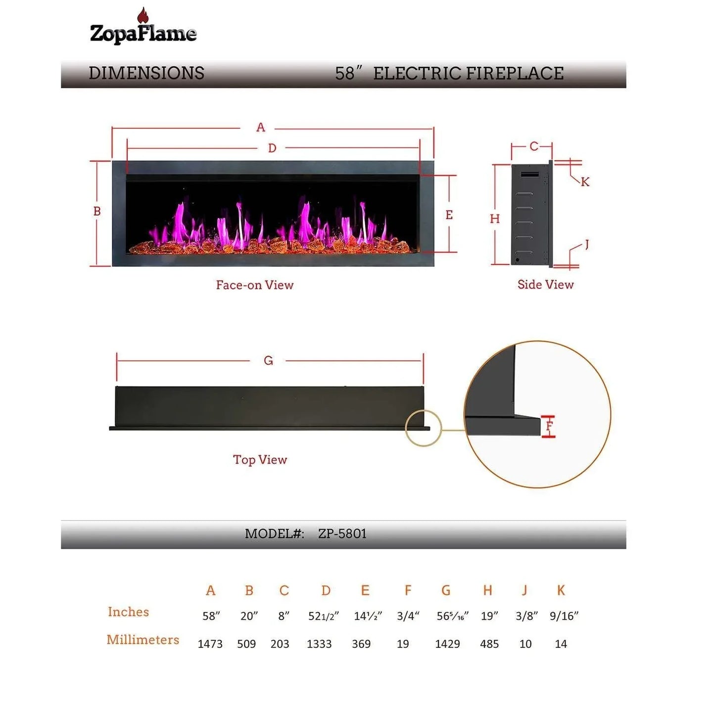 ZopaFlame™ 58" Linear Wall-mount Electric Fireplace - BG19588V